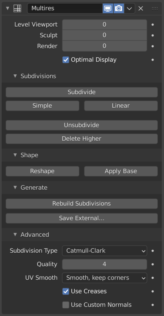 - Apply Base - модифицирует оригинальный меш, таким образом, чтобы он совпадал с формой подразделенного меша. Generate- Rebuild Subdivisions - перестраивает все возможные уровни подразделения для генерирования базового меша более низкого разрешения. Это используют для создания оптимизированной версии multiresolution до этого существовашего скульпта. Это опция доступна только до того как будут применено подразделение с помощью этого модификатора.