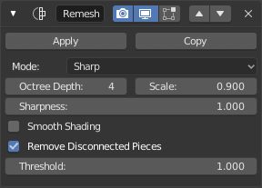 - Smooth Shading - для результата будет использоваться Smooth Shading, а не Flat Shading. Octree Depth - устанавливает разрешение результирующей геометрии. Низкие значения будут генерировать грани больше относительно исходных, высокие значения будут создавать более плотную сетку.Scale - с помощью этой опции можно фактически снизить разрешение для результата.Smooth Shading - переключается использование smooth shading для граней. Не сохраняет smooth/flat шейдинг исходных граней.Remove Disconnected Pieces - фильтрует мелкие не присоединенные части меша. Тонкие части исходного меша могут потеряться, и создать маленькие изолированные кусочки. Эта опция позволяет избавиться от них.- Threshold - используйте эту опцию для определения того, насколько маленькой должна быть часть, которую нужно удалить.
