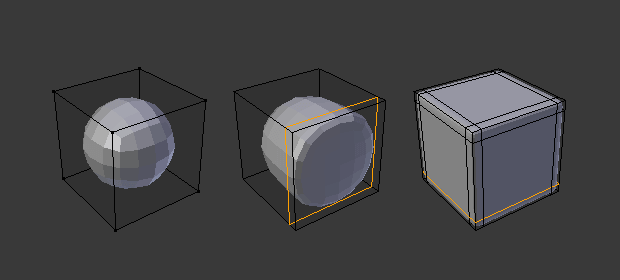 Уровень сглаживания куба равный 2, тот же куб с дополнительным Edge Loop, и тот же куб с шестью дополнительными Edge Loops.