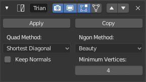 - Clip* *- разделяет полигоны, используя ear-clipping алгоритм (предоставляет похожие результаты на тесселяцию, используемые для viewport рендеринга). Keep Normals - при использовании пользовательских нормалей, пробует сохранить тот же шейдинг который был до триангуляцииMinimum Vertices** - минимальное количество вершин, при котором грани должны быть триангулированы. Например, установка этого значения на 5, предотвратит триангуляцию квадов и триангулирует только н-гоны (N-gons).